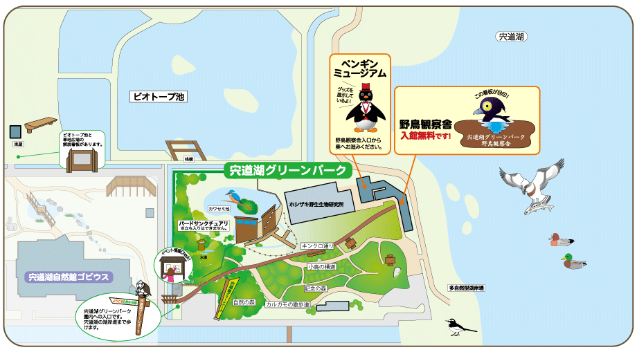 出雲平野が広がる宍道湖西岸に位置し、湖岸に隣接する野鳥観察舎がある多自然型公園です。観察舎がある敷地(約1.6ha)には、開園当初から植樹されている木々が大きく育ち、木陰や木漏れ日が感じられる一画があるほか、草地の広場もあります。また、通称「カワセミ池」と呼んでいる人工池や「水場」を含むサンクチュアリは、人の立ち入りを制限して動植物の生息を優先するエリアです。観察舎がある敷地の北側には、グリーンパークに付属する水深の浅い「ビオトープ池(約1.6ha)」があります。