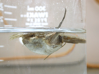 日本産ガムシ属には,ガムシHydrophilus acuminatus(全国),コガタガムシHydrophilus bilineatus cashimirensis(西日本以南),エゾガムシHydrophilus dauricus(北海道)の3種がいる.島根県ではガムシが多く,コガタガムシの記録もあるが少ない.筆者が検討した幼虫はガムシ1種のみである.※カッコ内は国内分布. ガムシは水生植物の豊富なため池に生息する.幼虫は丘陵地や山間の休耕田や水田でみられるが,水田で幼虫をみかけることは少ない. 卵(卵嚢)は独特の形状をしており,水面に浮いている. |