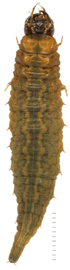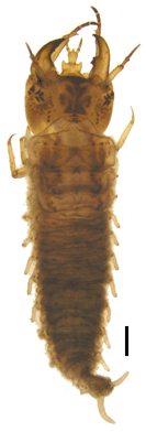 ガムシ1齢幼虫. 70%アルコール液浸標本のため,腹部が縮んでいる.腹部側面や尾端の肉質の突起がある.大顎は左右不対称で,右側の大顎の内側に歯がある. スケール1mm. |