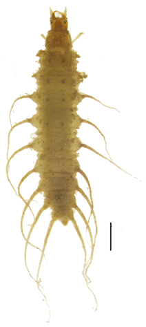 ヤマトゴマフガムシ3齢幼虫. 頭部の形状はシジミガムシ属に似ている. アオミドロの発生した水田に多くみられる. スケール1mm. |