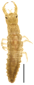 ヒメガムシ1齢幼虫. 大顎は左右対称で鋭く尖った歯がある. スケール1mm. |