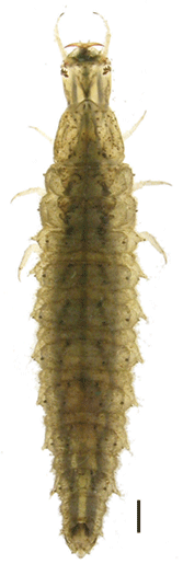 ヒメガムシ3齢幼虫. 成長すると腹部側面に突起が現れる.背面に「小」の形をした黒い模様がある. スケール1mm. |