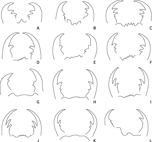 10b 頭部前縁には三角形の突起を欠き,複数の鋸歯があるか目立った鋸歯がない・・11