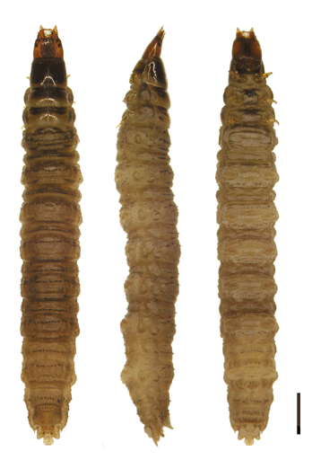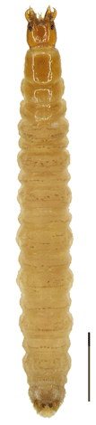 セマルガムシ3齢幼虫. ヒメセマルガムシに比べて色が濃く,特に胸部のキチン板の色が黒い. ヒメセマルガムシ同様に腹部背面には横方向の黒い毛の列がある. 流れのない川辺の砂の中から採集した. スケール1mm. |