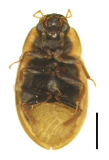 ルイスヒラタガムシの成虫. メスの腹部に卵嚢が付いている.幼虫は一斉に孵化する. |
