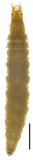 スジヒラタガムシ3齢幼虫. 大顎は左右対象. 腹部の側面には目立った突起はない.腹脚があり,イモムシのように歩く.腹脚に爪状の突起はない. スケール1mm. |