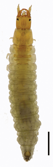 ルイスヒラタガムシ3齢幼虫. 基本的な構造はスジヒラタガムシと同じで,より小型. スケール1mm. |