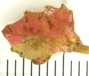 タマガムシ卵嚢. 水草や枯れ枝などに産み付ける.形は不定形. スケール1mm. |
