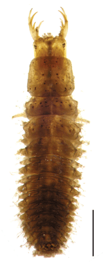 タマガムシ3齢幼虫. ため池で見られ,水草を攪拌すると水面に浮き上がってくる. スケール1mm. |