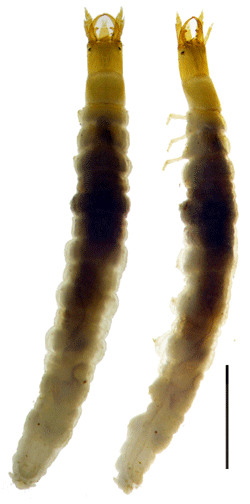 ツヤヒラタガムシ3齢幼虫. 基本的な形状はヒラタガムシ属に似ているが,体が細長い.川辺の石裏にいる. スケール1mm. |