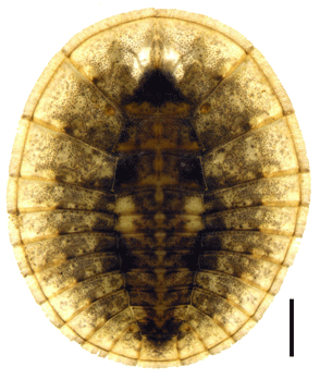 幼虫の前胸背板中央部の縫合線上には菱形の小片がある.斑紋には変異があるが,不明瞭で細かな白色と暗色の斑紋に覆われる.背面には顆粒があるが,側片上は疎らで,とりわけ縁辺部は顆粒をほとんど欠いている.本種の幼虫はHayashi