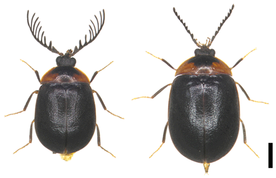 成虫の体長は3.2-4.4 mm(佐藤,1985b).体は楕円形で厚みがある.触角,頭部,上翅は黒色で,前胸背板は赤または橙色で,前方中央に黒色部がある.雄の触角は櫛ヒゲ状で,分枝は長い.雌の触角は弱い鋸歯状.色彩と体型から,日本産の他種とは容易に区別できる.中部地方産の個体は前胸背板が全体に黒くなることが知られ,亜種(Schinostethus