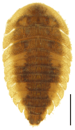 幼虫は非円形で隣接する腹部背板の側片はそれぞれ分離している.全体に逆卵形.胸部の側片は幅があり,先端は下方へ曲がり,先端は角張る.中・後胸の側板は平行四辺形.腹部の側片は胸部側片より細いが幅が広く,下方へ緩く曲がる.尾突起は長方形で,先端は切断状.表面には顆粒があり,6条の顆粒列が認められる.色彩は変異があるが,腹部背板第1・2,5・6節の外縁寄りに一対の明色斑がある.