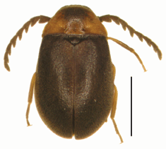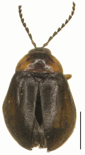 成虫の体長は2.3-2.8 mm(佐藤,1985b).前胸背板は赤色から橙色で、中央前半に黒色部がある.上翅は黒く,鈍い光沢がある.前胸背板の中央基部に一対のくぼみがある.触角は雄は鋸歯状で,雌は弱い鋸歯状.