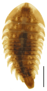 | 石垣島産のヒラタドロムシ科幼虫を検討したところ,これまでに国内で記録されていないセマルヒラタドロムシ属の一種が含まれていることが判明した.成虫との対応関係は未確認である.幼虫は,尾端の形状がチビヒゲナガハナノミ属によく似ているために混同されてしまう可能性が高い. 幼虫の形態は非円形で隣接する腹部背板の側片はそれぞれ分離している.全体にやや細長い逆卵形.胸部の中央には直線状の縫合線がある.胸部と腹部の側片は細く,下方へ緩く曲がり,先端は尖る.尾突起は長方形で,先端は切断状.表面には顆粒列がない.縫合線があること,側片が細く先端が尖っていることでチビヒゲナガハナノミ属とは容易に区別できる. セマルヒラタドロムシ属の幼虫形態は,Lee and Yang (1993)によりHomoeogenus laurae Lee et Yangの幼虫が報告されている.石垣島産の本属幼虫は,H. lauraeの幼虫に体型や斑紋がほぼ一致し,台湾に近いという地理的な条件(ヒラタドロムシ科では台湾と八重山の共通種が3種いる)からみて,同種である可能性が高い.今後,雄成虫の交尾器を確認することにより確定させたい. 検討標本.幼虫14頭を検討した. |