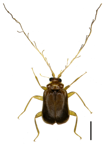 成虫の体長は2.0-2.4 mm(佐藤,1985b).体は柔らかく華奢.全体に薄い黄褐色を帯び,金属光沢を完全に欠いている.雄の触角は非常に長く,枝ヒゲ状で各節の分枝は細い.雌は雄に比べて体幅が大きく,触角は短い.