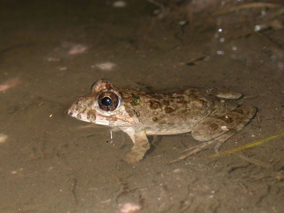 ゴビウスのまわりにもたくさんいる外来種のカエルです。すぐ逃げるのでなかなか写真を撮らせてくれない。 |