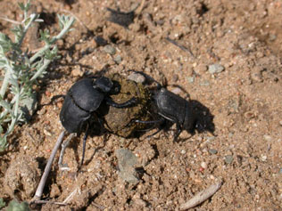 フンコロガシが糞を転がすのをはじめてみた。進行方向は左側。糞玉を埋めているペアも観察された。 この他の糞虫としては、マグソコガネ類や大型のエンマコガネ(チャバネエンマに似る)などもみられた。 |