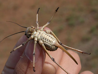 大きなキリギリス。もっと大きな個体もいる。羽が退化していて、ひたすら歩く。草丈の低い草原でよくみられた。 とにかくバッタ・キリギリスは多い。 |