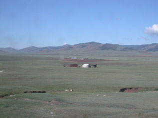 ガイドブックでおなじみのモンゴル大草原の風景。中央はゲル。ウシやウマ、ヒツジ、ヤギなどの放牧がいたるところでみられる。草丈はかなり低い。車から降りると、たくさんのバッタ・キリギリスと家畜の糞がみられた。 |