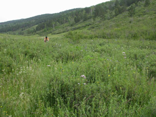 湿潤な谷底でかつ放牧が過密に行われていない場所では、膝〜腰ほどの高さの草原ができる。とにかく花が多くて、昆虫の個体数も多い。斜面を上がると植生や昆虫相が変化する。やたらマメハンミョウがたくさんいた。 |
