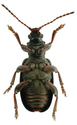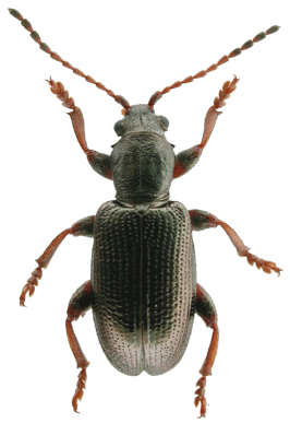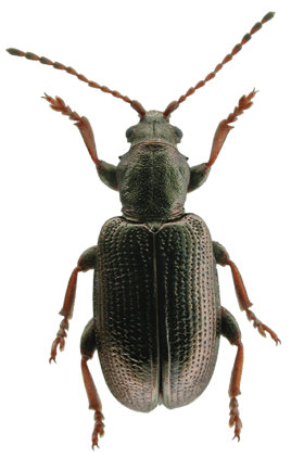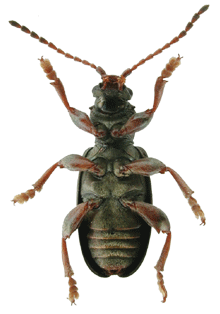 | 基準産地.広島県山県郡芸北町西八幡原新川溜池,標高770 m. 模式標本.ホロタイプ(♂)が大阪市立自然史博物館に収蔵されている. 標徴.体サイズは小型だが肩幅が広い(特に♀).前胸背板は背面側に丸く隆起し,背面は密に細かく不規則に点刻される.附属肢は2色または赤褐色.♂交尾器背片に隆起部がある.♂交尾器骨片(内袋)の側包板の外側には鋸歯状の突起があり,中央突起は長く,その先端は側包板の先端より突出する.産卵管は短く,波形の粗い鋸歯があり,先端部の角度は鈍角で,先端は突出する. 記載.体長:♂6.4-7.5 mm,♀6.6-7.6 mm. 背面の色彩:黒色または銅色の金属光沢を持つ. 頭部:複眼は小さく,複眼周囲の溝は不明瞭.頭頂は毛があり,中央部の縦溝は深い. 触角:各節は全体に暗褐色だが第1節は黒い.第5,4,3節はほぼ同長.第6節は第3節より短く,第2節は第6節より短い. 前胸背板:全体に丸みを帯びる.前側面の隆起があり,その周囲の溝は浅い.背面は細かく不規則な点刻に密に覆われる.亜基部襟帯は明瞭で横シワと点刻を伴う.中央縦溝は浅いが,連続する. 上翅:全体に太短い.間室の横シワは疎らで,細点刻は密.翅端は丸い. 肢:各肢は全体に褐色だが,腿節基半部,脛節の先端部は黒い.前脛節と中脛節の先端外側は明瞭に突出し,後脛節の先端外側は小さく突出する.後腿節は太く歯がある. 尾節板:全体に黄褐色だがその先端は暗色.先端は毛がある.♂♀共に先端部は浅く窪む. 産卵管:産卵管は短く,先端部に波形の粗い鋸歯がある.先端部の角度は鈍角で,先端は突出する. 腹板:腹板は全体に暗銅色だが,末端節には褐色部がある.末端節の先端は,♂では緩やかに丸まり,♀では角張る. ♂交尾器:陰茎先端部は角張るが,先端部の突出はない.背片の背面に隆起部がある.骨片(内袋)の側包板の外側には鋸歯状の突起があり,中央突起は長く,その先端は側包板の先端より突出する. 変異.上翅間室の細点刻は多くの個体では密だが,疎らな個体もある.後腿節の大歯の形状にはいくぶん変異がある.後肢および腹部末端節の色彩にはいくぶん変異がある. 比較.外見では,日本産のオオミズクサハムシや北米産のP. rufaに体型や附属肢の色彩が似ているが,より太短い.また,本種は骨片や産卵管の形状が特異で,他のミズクサハムシ属の種群とは明瞭に区別される. 分布.日本固有:本州(広島県芸北町).芸北町以外の産地はこれまでのところ知られていない. 生態.成虫は5月下旬〜6月中旬に出現し,スゲ属やイグサ属に訪花する(野尻湖昆虫グループ,1985). 系統関係.形態に基づく系統解析では,本種は日本産のオオミズクサハムシや北米産のP. rufaに近縁と推定された(Askevold, 1991).しかしながら,ミトコンドリアDNAや核DNAの塩基配列に基づく系統解析では,むしろキヌツヤミズクサハムやシラハタミズクサハムシの系統群に含まれることが示唆された(Sota and Hayashi, 2004). 検討標本.タイプシリーズおよび多数の模式産地からの標本を検討した. |