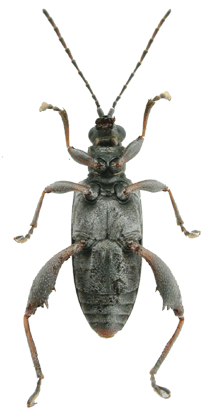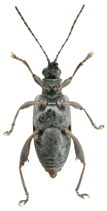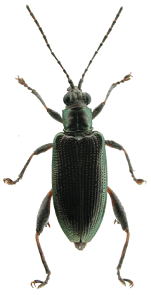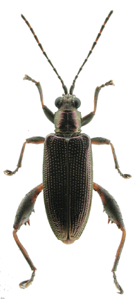 | 基準産地.“Hiogo”.現在の兵庫県神戸市周辺と考えられる. 模式標本.Askevold (1990)によれば,ドイツフランクフルトのForschungsinstitut Senckenbergにタイプが収蔵されている. 標徴.複眼は大きく突出する.触角の第3節と第2節はほぼ同長.前胸背板は横長の四角形で,前側面の隆起は不明瞭.背面は細かな横シワと細点刻に密に覆われる.上翅は金属光沢が強く,会合部間室は平滑で,他の間室は平滑だが上翅側方と翅端付近では横シワを伴う.翅端は幅広い切断状.♂の腹部第1腹節には一対のコブ状突起がある.肢は長く,2色.♂の後腿節は太く,歯が多い.♀の尾節板は縦に長い.陰茎先端部にはくびれがあり,先端に小突起がある.背片は幅があり,全体に縦長の楕円形で先端は丸まる. 記載.体長:♂6.1-7.0 mm,♀6.5-7.3 mm. 背面の色彩:ほとんどの個体は濃い紫色で金属光沢があり,青や緑,黒色の個体もいる. 頭部:複眼は大きく突出し,周囲の溝は深い.頭頂は毛があり,やや隆起する.中央の縦溝は深い. 触角:各節は暗色だが,基部は褐色.第6節は第5節より短く,第4節とほぼ同長.第3節は第4節より短く,第2節とほぼ同長.第5節は第2節の約2倍の長さ. 前胸背板:全体に横長の四角形で,前側面の隆起は不明瞭.中央縦溝は深い.背面は細かな横シワに密に覆われ,細点刻を伴う.亜基部襟帯は狭く,シワがある. 上翅:会合部間室は平滑で,翅端に向かって徐々に狭まる.他の間室も平滑だが,上翅の側方と翅端では横シワがある.翅端は幅広い切断状で,外角は鈍角でいくぶん丸まり,内角は鈍角. 肢:後腿節は太く,♂では2つの大きな歯があり,♀では1つの大きな歯がある.歯の後方に鋸歯を伴う.後脛節は著しく長く,♂では下面に粗い鋸歯を伴う. 尾節板:前体形は♂では逆台形,♀は縦に長い.先端は♂では切断状,♀では丸まる. 腹板:第1腹節の中央に一対のコブ状突起がある.末端節の先端は,♂は切断状,♀は丸いがやや尖る.♂の先端部の窪みは,浅いが明瞭. ♂交尾器:陰茎先端部にはくびれがあり,先端に小突起がある.背片は楕円形で先端は丸い.骨片は小さく,基部片は長い. 比較.本種は東南アジアに分布するDonacia javanaにもっともよく似ている.しかし,ふ節の形状や,陰茎先端部の形状により区別可能である. 分布.日本(北海道,本州,四国,九州,佐渡),極東ロシア(プリモルスキー),朝鮮半島,中国(江蘇,安徽,湖北,江西,湖南),台湾,フィリピン. 生態.成虫は5月〜11月に出現し,ジュンサイやヒツジグサなどの浮葉を食害する. 系統関係.分子系統の解析結果によると,本種はイネネクイハムシに近縁である(Sota and Hayashi, 2004).外部形態的には,D. javanaの姉妹種であることが予想される. 検討標本.北海道,本州,プリモルスキー産の標本を多数検討した. |