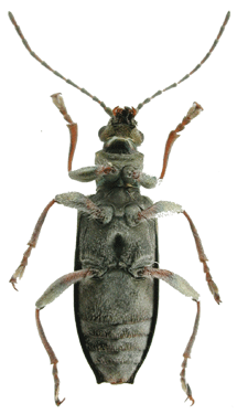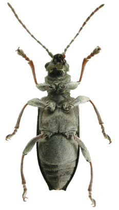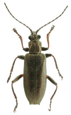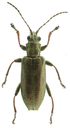 | 基準産地.ヨーロッパ. 模式標本.ホロタイプの所在は不明. 標徴.前胸背板は密に点刻される.上翅間室は密に横シワが覆い,点刻列に伴う点刻は粗い.上翅端外角は突出する.肢は2色で,腿節の基部は赤褐色.後腿節は歯を欠く.陰茎は先端部のくびれを欠き,先端はやや尖る.骨片の中央突起は細長く伸張し,背面がわげ弧状に曲がる. 記載.体長:♂6.0-7.5 mm,♀8.0-8.9 mm. 背面の色彩:日本産の個体はすべて銅色で,緑色を帯びる個体もいる.ヨーロッパ産の個体には,キンイロネクイハムシのような上翅に赤や青色の縦条斑を持つ個体がいる. 頭部:複眼は突出し,周囲の溝は深い.頭頂は毛があり,隆起し,中央部の縦溝は深い. 触角:各節は銅色だが,基部は赤褐色.第6節は第5節より短く,第4節とほぼ同長.第3節は第4節より短く,第2節より長い.第5節は第2節の約2倍の長さ. 前胸背板:全体に四角形.前側面の隆起があり,周囲の溝は浅い.中央縦溝がある.背面は粗く点刻される.亜基部襟帯は浅く,粗く点刻される. 上翅:会合部間室は密に横シワが覆い,翅端に向かって徐々に狭まる.他の間室は深い横シワが覆う.状翅端は切断状で,外角は丸く突出し,内角は直角に近い. 肢:腿節は先端半分が銅色で,基部の半分が赤褐色.脛節は全体に赤褐色で,部分的に銅色.後腿節は細長く,歯を欠く. 尾節板:先端は♂では窪み,♀では狭い切断状. 腹板:末端節の先端は♂では切断状,♀では尖る.♂の先端部の窪みがあるが,浅い. ♂交尾器:陰茎先端部はくびれを欠き,先端に向かって徐々に狭まる.背片は細長い.骨片の中央突起は細長く伸張し,背面側に弧状に緩く曲がる.背面突起は細長い.基部片は短い. 比較.本種はヨーロッパから日本まで旧北区に広く分布する.上翅の色彩に変異がみられるが,骨片を含め,交尾器形態はよく一致する.外部形態的には,本種はDonacia simplex Fabriciusにもっとも良く似ている.色彩や尾節板,陰茎,背片の形状が一致するが,骨片の形状はまったく異なる.翅端部の突起が弱い個体は,肢が暗色のキアシネクイハムシと見間違える可能性がある. 分布.日本(北海道,本州),南千島(国後),極東ロシア(サハリン,アムール,プリモルスキー),中国(黒竜江,吉林,西蔵,北京,河北),中央アジア,ヨーロッパ. 生態.成虫は5月〜8月に出現.10月の観察例もある.成虫はガマ属やミクリ属の葉を食害する.池や水路などに生息する. 系統関係.分子系統の解析結果によると,本種の姉妹種は不明である(Sota and Hayashi, 2004). 検討標本.日本,プリモルスキー,ヨーロッパの標本を多数検討した. |