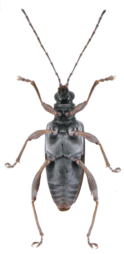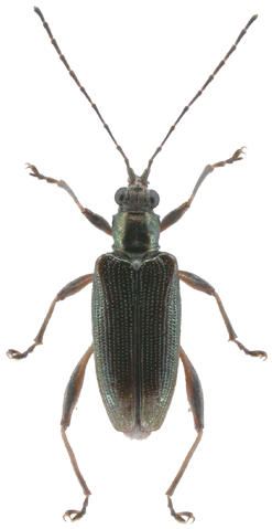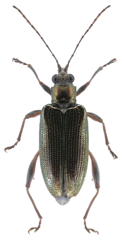 | 基準産地.中国北京. 模式標本.Askevold (1990)によれば,フランスのパリ自然史博物館にホロタイプ(♀)が保管されている. 標徴.複眼は大きく突出する.触角第3節は第2節より短く,第4節は第5節より短い.前胸背板は横長の四角形で,細かな横シワと細点刻に覆う.上翅は光沢があり,会合部間室は平滑.他の間室は平滑だが,上翅の側方と翅端はシワがある.翅端は幅広い切断状.腹部腹板第1節は一対のコブ状隆起がある.肢はながく,2色.後腿節は細長く,♂♀共に1つの大きな歯がある.♀の尾節板は長い.陰茎先端にはくびれがあり,先端に小突起がある.背片は楕円形で先端は丸い. 記載.体長:♂6.0-7.5 mm,♀6.0-7.5 mm. 背面の色彩:ほとんどの個体は褐色で,赤や緑,青,紫色の光沢を帯びる. 頭部:複眼は大きく,突出する.複眼周囲の溝は深い.頭頂に毛があり,中央の縦溝は深い. 触角:第5節は第4節より短く,第6節より短い.第3節は第6節とほぼ同長で,第2節より長い.第5節は第2節の約2倍. 前胸背板:全体に横長の四角形.前側面の隆起は不明瞭.中央縦溝がある.背面は細かな横シワと細点刻に覆われる.亜基部襟帯は狭く,シワがある. 上翅:会合部間室は平滑で,翅端に向かって徐々に狭まる.他の間室は平滑だが,上翅の側方と翅端部ではシワがある.翅端は幅広い切断状で,外角は鈍角でいくぶん丸まる.内角は鈍角. 肢:肢は2色.後腿節は細長く,♂♀共に1つの明瞭な歯がある.後脛節は長い. 尾節板:全体形は,♂は逆台形,♀は縦に長い.先端は,♂は切断状だが,いくぶん丸い.♀は丸まる. ♂交尾器:陰茎先端部にはくびれがあり,先端に小突起がある.背片は楕円形で先端は丸い.骨片は小さく,中央突起は短く先端は切断状.基部片は伸張する. 腹板:第1腹節の中央に一対のコブ状突起がある.末端節の先端は,♂は切断状,♀は丸いがやや尖る.♂の先端部の窪みは,浅いが明瞭. 比較.尾瀬ヶ原から記載されたヒメネクイハムシは翅端の形状に特徴があるが,骨片を含め交尾器の形状はイネネクイハムシと一致し,両者を別種として区別することはできない(Hayashi and Shiyake, 2004). 分布.日本(北海道,本州,四国,九州,佐渡,隠岐,種子島,与那国),極東ロシア(プリモルスキー,アムール),朝鮮半島,中国(黒竜江,遼寧,北京,河北,陜西,山東,河南,江蘇,安徽,浙江,湖北,江西,福建,広東,四川,貴州),台湾,東南アジア. 生態.成虫は5月〜11月に出現し,ヒルムシロ属,ハス,ヒシ属,ガガブタ,アサザなどの浮葉を食害する.本州東部ではハスやヒシ属の生える溜池などでふつうにみられる. 系統関係.分子系統の解析結果によると,ヒメネクイハムシは本種のクラスターに含まれ,ガガブタネクイハムシと姉妹関係にある(Sota and Hayashi, 2004). 検討標本.北海道,本州,佐渡,プリモルスキー,朝鮮半島,中国の標本を検討した. |
