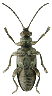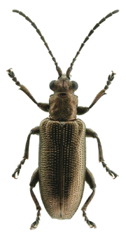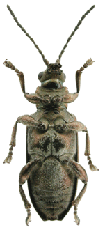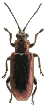 | 基準産地.兵庫県芦屋市奥池. 模式標本.ホロタイプが大阪市立自然史博物館に保管されている. 標徴.複眼が大きく,突出する.肢は全体に金属色で,短い.前胸背板は粗く点刻される.上翅間室は密な横シワがある.陰茎先端部にはくびれがあり,先端に小さな突起がある.骨片の中央突起は伸張する. 記載.体長:♂ 6.0-7.0mm,♀7.0-8.0mm. 背面の色彩:ほとんどの個体は銅色で金属光沢がある.♀に青色の個体がいる. 頭部:複眼は大きく突出し,複眼周囲の溝は深い.頭頂は毛があり,著しく隆起する.中央部の縦溝は深い. 触角:各節は全体に銅色.第6節は第5節より短く,第4節とほぼ同長.第3節は第4節より短く,第2節よりわずかに長い.第5節は第2節の約2倍の長さ. 前胸背板:全体に四角形.中央縦溝は細く,不明瞭な個体もいる.前側面の隆起はあるが,周囲の溝は浅い.背面は粗く点刻され,細かな横シワを伴う.亜基部襟帯は浅い. 上翅:光沢がある.会合部間室はシワがあり,翅端に向かって徐々に狭まる.翅端は全体に切断状で,外角は突出し,内角はほぼ直角. 肢:全体に金属色.後腿節には1つの歯があり,その後方に細かな鋸歯を伴う.脛節の先端部の外角は,前脛節は鋭く尖り,中・後脛節は角張る. 尾節板:先端は,♂では全体に切断状で中央部がわずかに突出する.♀は尖る. 腹板:末端節の先端は,♂では切断状で,♀では尖る.♂の先端部の窪みは浅いが,明瞭. ♂交尾器:陰茎先端部にはくびれがあり,先端部には小突起がある.背片は細長い.骨片の中央突起は伸張し,細長い. 変異.尾節板先端部の形状は♂♀共にやや変異がある. 比較.近縁種との比較については,アオノネクイハムシの項目を参照.本種はツヤネクイハムシにも似ているが,カツラネクイハムシの肢全体が金属色であることで容易に区別できる. 分布.本州(愛知県以西),九州. 生態.成虫は5月〜6月に出現する.成虫はハリイ類の葉を好んで食害する.スゲ属やイグサ属に訪花することがある.生息地は主に明るい湿地である. 検討標本.ホロタイプを含め多数の本州産の個体を検討した. |