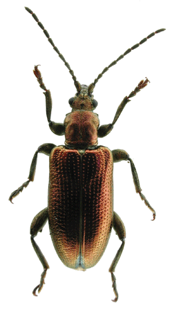 | 基準産地.ヨーロッパ.Plateumaris niponensis Nakaneは長野県上高地産の標本に基づき記載された. 模式標本.本種のホロタイプの所在は不明.P. niponensisのホロタイプは札幌市の北海道大学農学部に保管されている. 標徴.前胸背板には横シワが発達し,中央縦溝は深く連続する.背面は金属光沢があり,色彩変異が大きい.肢は全体に金属色.後腿節の歯は大きく,幅がある.触角第3節は第2節よりわずかに長い.♂の尾節板の先端は明瞭に窪む.♂交尾器骨片の中央突起の先端は丸い. 記載.体長:♂6.5-7.4 mm,♀7.0-8.8 mm. 背面の色彩:銅色の個体が多いが変異が大きく,黒,紫,青,緑,黄,赤などの個体がいる.青色は♂個体に出現する. 頭部:複眼は小さく,複眼周囲の溝は不明瞭.頭頂に毛があり,中央の縦溝は深い. 触角:触角は背面同様,全体に金属色が強い.第5節は第6節より長く,第6節は第4節とほぼ同長.第3節は,第4節より短く,第2節よりわずかに長い.第4節は第2節の約2倍の長さ. 前胸背板:前側面の隆起は明瞭で,その周囲の溝は深い.背面は密に点刻され,粗い横シワに覆われる.亜基部襟帯は明瞭で,密な横シワと点刻を伴う.中央縦溝は深く,連続する. 上翅:間室の横シワは粗い.翅端部はやや丸みを帯びた切断状で,外角は丸まり,内角は直角に近い. 肢:すべての肢は金属色.前脛節の先端外側には突起があり,中脛節と後脛節の先端外側には小さな突起がある.後腿節は大きな1つの歯を持つ. 尾節板:先端部に毛があり,♂の先端は深く窪み,♀は浅く窪む. 産卵管:産卵管は著しく伸張しない.先端部の鋸歯は細く,先端の角度はほぼ直角.先端は少し突出する. 腹板:毛が濃い.末端節の形状は,♂の先端は切断状で,♀は丸まる. ♂交尾器:陰茎先端部は直線的に狭まり,先端は尖る.背片先端部は丸い.骨片の側包板は丸みを帯び,幅が広い.中央突起は太く,側包板より短く,その先端は丸い. 変異.尾節板先端および陰茎先端部の形状にはいくぶん変異がある. 比較.日本産の本種はヨーロッパから知られているPlateumaris discolor Panzerであるという意見がある(例えば,Lays, 1989).ヨーロッパ産のPlateumaris sericea (Linnaeus) は,触角第3節が第2節より明瞭に長く,前胸背板の横シワが細かいなどの特徴があり,シラハタミズクサハムシによく似ている.また,P. discolorとされる個体は第3節が第2節よりわずかに長い程度で,前胸背板の横シワが粗く,尾節板の先端は窪み,陰茎先端部が尖るなど,日本産の本種にきわめてよく似た特徴を持っている.しかしながら,ヨーロッパ産のP. sericeaとP. discolor両者の個体は明確に分けられるわけではなく,上記の特徴が中間的な個体も少なくない.Askevold (1990)は両者の骨片形態に明瞭な差異がみいだせないことを主な根拠として両者が同種であると結論づけた.筆者も形態的に両者を区別することが困難であることから,Askevold (1990)の見解に従い,Plateumaris sericea (Linnaeus)の学名を充てておく.この見解はあくまでも形態学的な検討の結論であり,分子系統学的な再検討が必要である. 本種はシラハタミズクサハムシにきわめてよく似ているが,触角や前胸背板,尾節板を検討することにより識別は十分可能である.確実に区別するには♂交尾器骨片の中央突起先端部を検討する必要がある.キヌツヤミズクサハムシの中央突起先端部が丸まるのに対し,シラハタミズクサハムシでは窪み,その違いは明瞭である. 分布.日本(北海道,本州,九州,佐渡);南千島(択捉,国後),サハリン,カムチャッカ,アムール,ハバロフスク,プリモルスキー,朝鮮半島,中国,モンゴル,中央アジア,ヨーロッパ. 生態.成虫は5月〜7月に出現し,スゲ属やイグサ属,ガマ属,アヤメ属,ミクリ属,ミズバショウなど多様な植物に訪花する(野尻湖昆虫グループ,1985).10月頃に成虫を見かけることがあるが,単に成虫が羽化の時期を誤ったためのかは不明.中部地方以北では,あらゆるタイプの湿地,池,水路などに生息している. 系統関係.本種はシラハタミズクサハムシと姉妹種であると推定されている(Askevold, 1990).日本産の種のDNA解析からも両種は姉妹種であると推定されている(Sota and Hayashi, 2004). 検討標本.日本各地をはじめ,極東ロシア,朝鮮半島(韓国),中央アジア,ヨーロッパ産の多数の標本を検討した. |