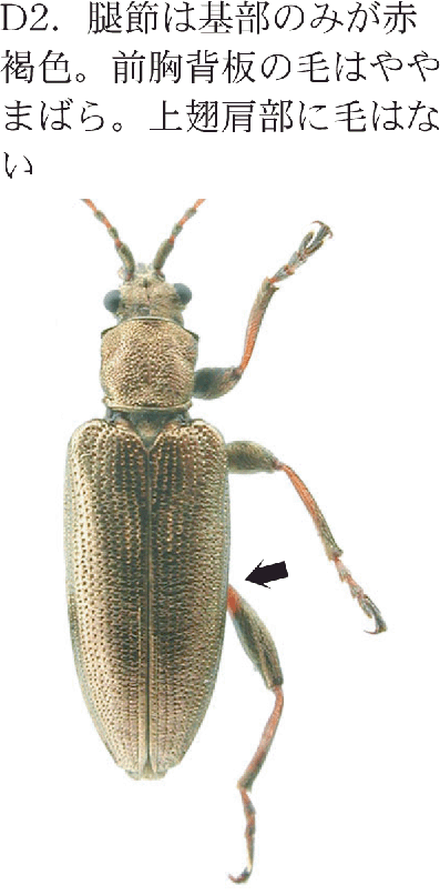 D2.腿節は基部(根本)のみが赤褐色.前胸背板の毛はややまばら.上翅肩部に毛はない.