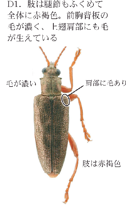 D1.肢は腿節(ふともも)も含めて全体に赤褐色.前胸背板の毛が濃く,上翅肩部にも毛がはえている.