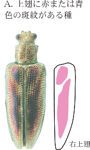 A.上翅に赤または青色の斑紋がある種.肢全体に金属色がある.
