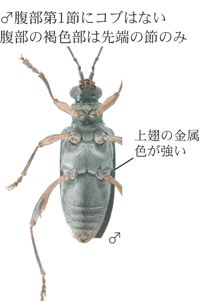 オス**腹部第1節にコブはない.腹部の褐色部は先端(末端)の節のみ.上翅は全体に金属光沢が強い.