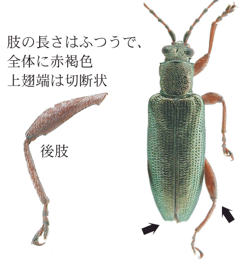 肢の長さはふつうで,全体に赤褐色*.上翅の先端は切断状.