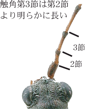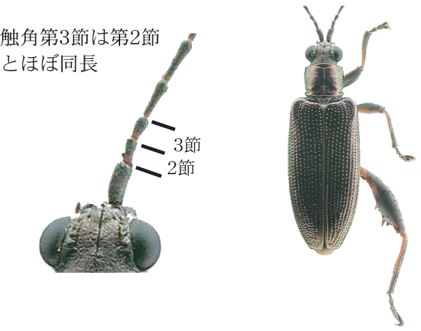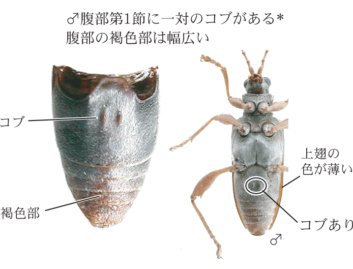 オス**腹部第1節に1対のコブ状突起がある.腹部の褐色部は幅が広い.上翅は金属光沢が弱く,褐色を帯びる個体が多い.