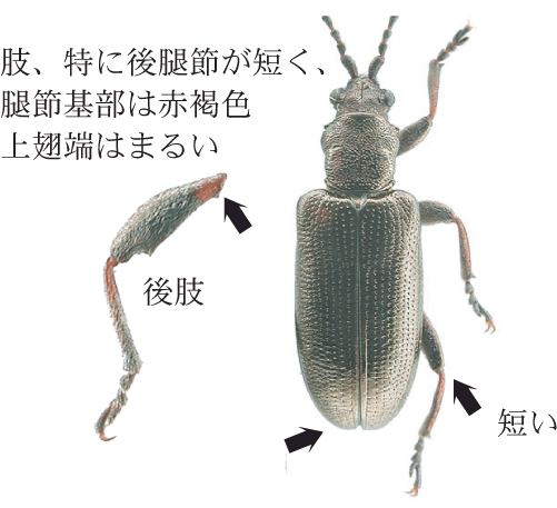 肢,とくに後腿節(後ろ足のふともも)が短く,腿節の基部(根本)は赤褐色.上翅の先端はまるみを帯びる