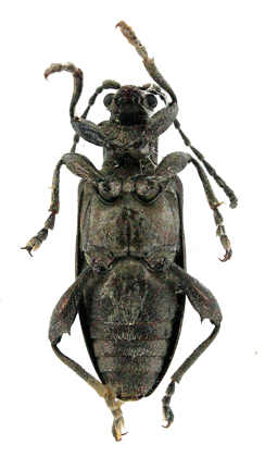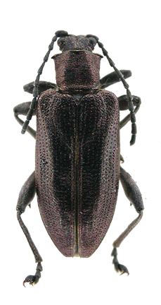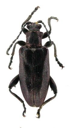 | 基準産地.北海道東川町小沼平. 模式標本.ホロタイプは大阪市立自然史博物館に収蔵されている. 標徴.背面は一般に黒色.前胸背板は密に点刻され横シワを伴う.上翅間室は細かな横シワが密に覆う.肢は全体に金属色で,後腿節は大きな1つの歯を持つ.♂交尾器の陰茎先端はくびれがなく,先端の小突起を欠く.骨片の中央突起は長く,背面側へ緩く弧状に曲がり,先端部は尖る. 記載.体長:♂7.3-8.4 mm,♀8.4-8.8 mm. 背面の色彩:ほとんど個体は黒色.紫色の個体もいる. 頭部:複眼は小さく,複眼周囲の溝は深い.頭頂は毛があり,隆起し,中央部の縦溝は深い. 触角:各節は全体に黒色.第4節は第3節よりわずかに長く,第2節の約2倍の長さ.第5節は第2節〜6節の中でもっとも長い. 前胸背板:全体に四角形でやや横長.前側面の隆起があり,周囲の溝は浅い.背面は密に点刻され,深い横シワを伴う.中央縦溝は深い.亜基部襟帯は浅く,シワと点刻を密に伴う. 上翅:会合部間室はシワがあり,翅端に向かって徐々に狭まる.他の間室は細かな横シワと細点刻が密に覆う.翅端は幅の狭い切断状で,外角はまるまり,内角は直角に近い. 肢:全体に銅色.脛節の先端部外角は、前脛節は尖り、中・後脛節では角ばる。後腿節は長く、大きな1つの歯がある. 尾節板:先端は,♂はやや丸みを帯びた切断状,♀は丸いがやや尖る. 腹板:末端節の先端は,♂は切断状,♀は丸まるがやや尖る.♂の先端部の窪みは浅い. ♂交尾器:陰茎の先端部はくびれがなく,先端の小突起を欠く.背片は細長い.骨片の中央突起は背面側に緩く曲がる.先端部はヒレ状の小突起を欠く. 比較.ヒラタネクイハムシの項目を参照. 分布.北海道大雪山系. 生態.本種の生態はヒラタネクイハムシに似ているが,詳細は不明.成虫は6月〜7月に出現する.キタヒラタネクイハムシと混棲し,スゲの花に群がる. 検討標本.タイプシリーズを含め多数の標本を検討した. |