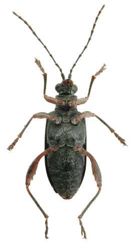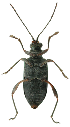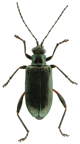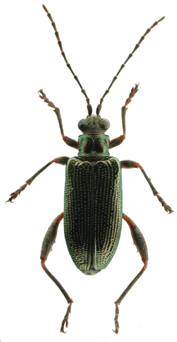 | 基準産地.広島県大和町福田. 模式標本.ホロタイプは国立科学博物館に収蔵されている. 標徴.複眼は大きく,突出する.前胸背板は横長の四角形で,背面は光沢が強く浅い横シワに覆われる.上翅は光沢が強く,会合部間室は平滑.他の間室は平滑だが,側方と翅端付近では横シワがあり,翅端は幅広い切断状.肢は長く,2色.♂の後腿節は細長い.♀の尾節板の先端は逆三角形.陰茎先端部にくびれがあるが,先端は丸い.背片は幅広く,先端は中央に切れ込みがあり,中央部に縦溝がある. 記載.体長:♂5.8-7.6 mm,♀6.6-8.4 mm. 背面の色彩:銅色で強い金属光沢を持ち,緑色を帯びる. 頭部:複眼は大きく突出し,周囲に溝がある.頭頂は毛があり,中央に深い縦溝がある. 触角:第4節は第5節よりわずかに長く,第6節より長い.第3節は第6節より短く,第2節より長い.第4節は第2節の約2倍よりいくぶん長い. 前胸背板:全体に横長の四角形.前側面の隆起があり,周囲の溝があるが浅い.中央縦溝は深い.背面は横シワが覆う.亜基部襟帯は浅いが明瞭,シワを伴う. 上翅:会合部間室は平滑で,翅端に向かって徐々に狭まる.他の間室は平滑だが,側方と翅端部では横シワがある.翅端は幅広い切断状.外角は鈍角で,内角は直角に近い. 肢:2色で,脛節および腿節の基部は赤褐色.後腿節は長く,♂は2つの鋭く尖った歯を持ち,♀では1つの鋭く尖った歯がある.後脛節は著しく長い. 尾節板:♂は全体に逆台形だが,先端は丸みを帯びる.♀は逆三角形. 腹板:末端節の先端は,♂は切断状,♀では丸まる.♂の先端部の窪みは浅いが,明瞭. ♂交尾器:陰茎先端はくびれがあるが,先端に小突起がある.背片は幅が広いヘラ状で,先端が深く切れ込み,背面中央に縦溝がある.骨片の中央突起は短いが,基部片は伸張する. 比較.本種の背面の色彩および後肢の形状はイネネクイハムシに似ている.しかし,本種は♂腹部に一対のコブ状突起を欠くため,亜属の異なるイネネクイハムシとは明瞭に異なる.コウホネネクイハムシは翅端が全体に丸みを帯びるため,翅端が幅広い切断状の本種とは区別される. 分布.本州. 生態.成虫は6月〜9月に出現し,オグラコウホネやヒメコウホネ,コウホネの葉を食害する. 系統関係.分子系統の解析結果によると,本種はコウホネネクイハムシに近縁である(Sota and Hayashi, 2004). 検討標本.広島県および兵庫県産の標本を検討した. |