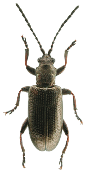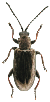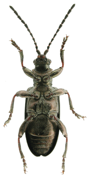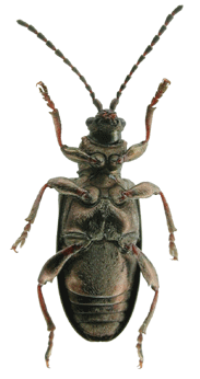 | 基準産地.京都府大悲山. 模式標本.ホロタイプは北海道大学農学部の中根コレクションに保管されている. 標徴.複眼は小さい.肢は短く,腿節の基部は赤褐色.前胸背板は粗く点刻される.上翅間室は密な横シワがあるが,浅い.陰茎先端部のくびれは浅く,先端に小さな突起がある.骨片の中央突起は太短く,下方に向かって曲がる. 記載.体長:♂5.0-6.2 mm,♀6.0-6.5 mm. 背面の色彩:ほとんどの個体は銅色で金属光沢がある.まれに青色の個体がいる. 頭部:複眼は小さく,複眼周囲の溝は浅い.頭頂は毛があり,中央に縦溝がある. 触角:各節は全体に銅色だが,第2節〜第5節の基部は赤褐色.第6節は第5節より短く,第4節よりわずかに長い.第3節は第4節とほぼ同長で,第2節より長い.第5節は第2節の約2倍の長さ. 前胸背板:全体に四角形.中央縦溝があり,まれに深い.前側面の隆起があり,周囲の溝は浅い.背面は粗く点刻され,部分的に平滑.密に点刻される個体もいる.亜基部襟帯は浅く,密に点刻される. 上翅:光沢が強い.会合部間室は横シワがあり,翅端に向かって徐々に狭まる.他の間室は浅い横シワを伴い,密な細点刻を伴う.翅端は幅の狭い切断状で,外角・内角共に丸まる. 肢:脛節の外側,腿節の基部は赤褐色.後腿節は太く,小さな歯を1つ持つ.前・中・後脛節の先端部の外角は鋭く尖る. 尾節板:先端は♂♀共に浅く窪む. ♂交尾器:陰茎先端のくびれは浅く,先端に小突起がある.背片は細長い.骨片は小さく,中央突起は太短く,下方に曲がる. 腹板:末端節の先端は,♂は切断状,♀は尖る.♂の先端部の窪みは浅い. 比較.陰茎先端部および骨片の形状は日本産フトネクイハムシ亜属の種としては特異な形状を持つ.一見,カツラネクイハムシに似ているが,腿節の色彩が異なる. 分布.本州(宮城県以南),佐渡. 生態.成虫は5月〜6月に出現する.スゲ類に訪花する(野尻湖昆虫グループ,1985).生息地は日当たりの良い湿地である. 系統関係.分子系統の解析結果によると,本種はキアシネクイハムシに近縁である(Sota and Hayashi, 2004). 検討標本.ホロタイプを含む多数の標本を検討した. |