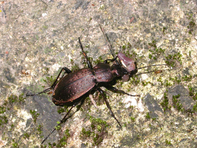 オキオサムシ 側溝で発見。ミミズを食べていた。赤い体色が特徴なのだそうです。 |