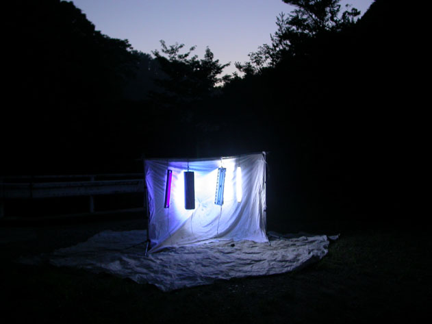 灯火採集 通称ナイター。ブラックライト(紫外線)にたくさんの昆虫が集まってくる。天気に恵まれ、様々な昆虫をみることができた。 |