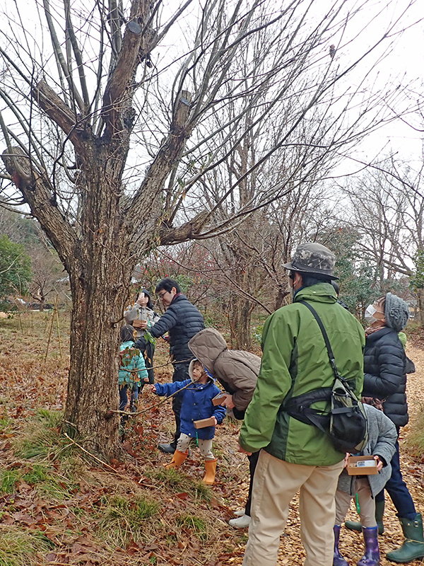園内で採集しておいた数種類の樹木からひとつを選んで虫めがねや顕微鏡を使って樹木の詳しく観察していただきました。その後外に出てそれぞれ観察した樹木の実際の姿を観察しました。花はありませんが、ほかの季節とはひと味違った冬の木の楽しさを体験していただきました。