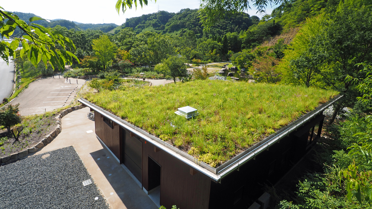 管理棟は、園内全体の植栽計画に合うよう景観にも配慮した設計をしました。いちばんの特徴は、屋根に植栽ができるようにしたことです。建物の手前の植栽から草屋根、そして奥の丘陵地の林までつながる植物の景観が建物の存在感を和らげてくれつつ、その特徴から公園の見所の一つになっています。屋根の植物は、園内全体で進めている植栽と同じく、公園近辺に自生している在来の多年草です。園内の植栽は、多様な動植物の生息場所としての機能向上も目的としていますが、管理棟のスペースもその一部となります。また、夏場の高温対策・省エネルギーといった効果も期待されます。