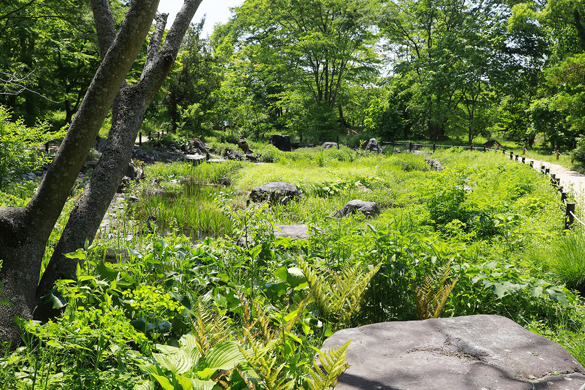半湿性ビオトープの創出公園内には、かつて菖蒲園としていた窪地がありましたが、乾燥化が進んでセイタカアワダチソウなどが生える草むらになっていました。そこで、窪地の形状を利用して、園路に降った雨が流れ込むように設計し、水が浅く溜まるビオトープを造成しました。少し掘り下げたことで湧水も出るようになり、降水量に応じて水が増えたり、なくなったりします。この水量変化は一時的に水域を利用する昆虫や両生類の繁殖場所として機能し、大きな石や切り株を置くことにより、カエルやトカゲの日光浴や隠れ場所、ヤゴの羽化・トンボのとまる場所として利用されています。