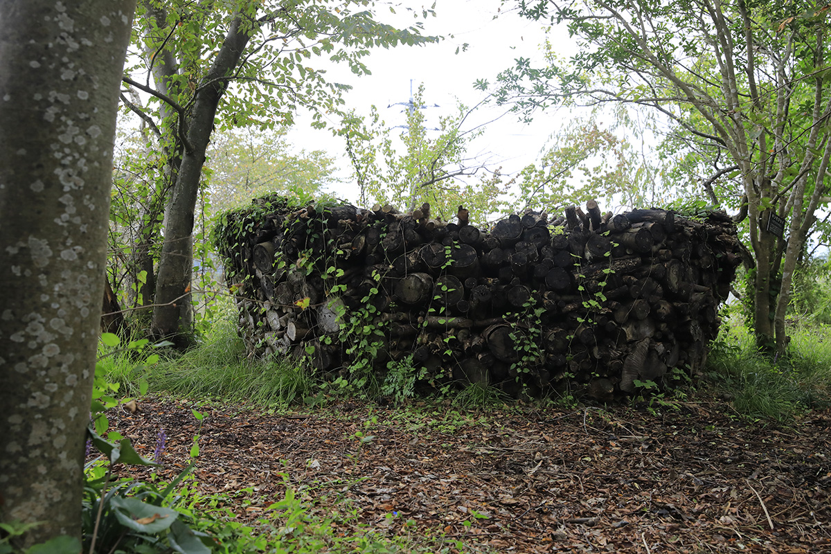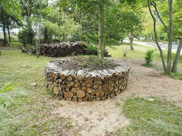 公園内に植栽された樹木は開園から20年以上が経過し、大きく生長しました。枝葉が広がり、混み合ってきたことで枝枯れも見られるようになりました。そのため、剪定はもちろん、低く幹を残して切ることで萌芽させて高低差をつけたほか、場所によっては伐採も必要でした。これにより生育した木々に適した状態となり、林床に日光が当たりやすくなったほか、園内の見通しも良くなりました。また、伐採した樹木の幹は積み上げて、小動物の生息場所としています。