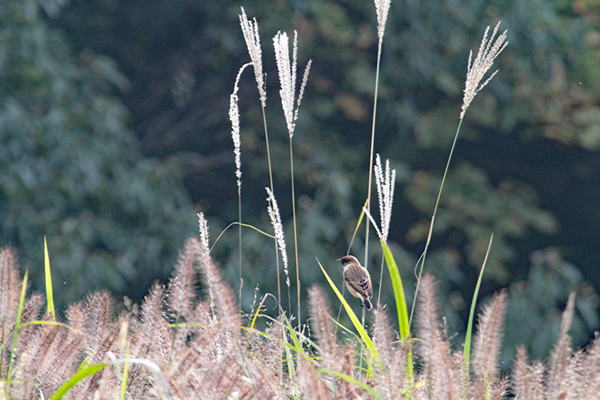 近年、尺の内公園では在来の多年草植物を用いた植栽整備に取り組んでいて、管理棟の全面改修にあたっても、その屋根全体が草に覆われた草屋根構造にしました。今日は、その屋根の上で4羽のノビタキがしきりに飛び交いながら採食中でした。(写真はその草屋根にいたノビタキです)ノビタキは草原が好きな鳥なので、斐伊川河川敷のヨシ原のヨシ原では春や秋にわりとよく見るのですが、尺の内公園のような里山に接したところでは、これまであまり見かけませんでした。旅鳥として渡りの途中で立ち寄っただけなのでしょうが、ここを気に入って、これからもたくさん立ち寄って貰えるようになったら良いなと思いました。