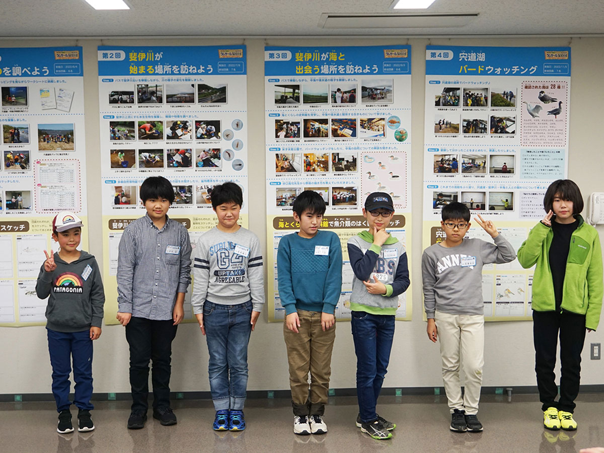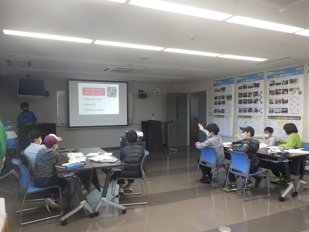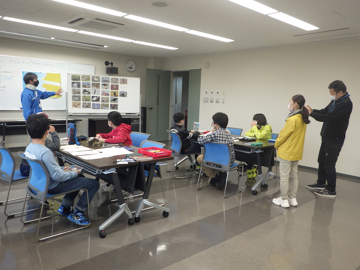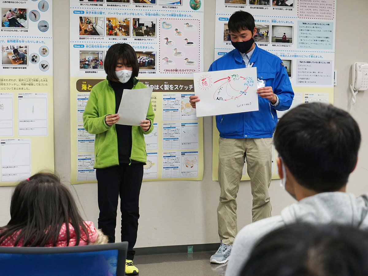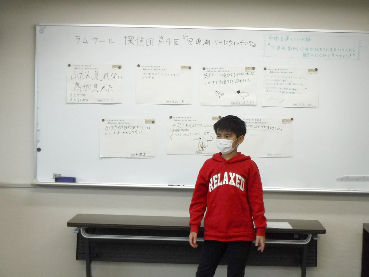 今年度の探偵団の締めくくりとして活動報告会を行いました。午前中は、これまでの活動を振り返ったり、ラムサール条約について学んだことをおさらいしたりした上で、発表のための準備や練習をしました。午後の活動報告会では、団員一人ひとりに活動を通して楽しかったことや印象に残ったこと、発見したことなどを説明してもらったほか、今年度のお題「宍道湖・斐伊川・中海が私たちにもたらしてくれる自然のめぐみを見つけて教えてください」に対する答えを発表してもらいました。どの団員も堂々と発表し、保護者のみなさんから出た質問にもしっかりと受け答えることができていました。また、斐伊川水系がもたらしてくれるさまざまなめぐみを見つけただけでなく、それらを自分たちが守っていきたいという強い思いを感じることもできました。