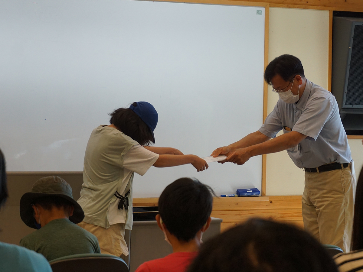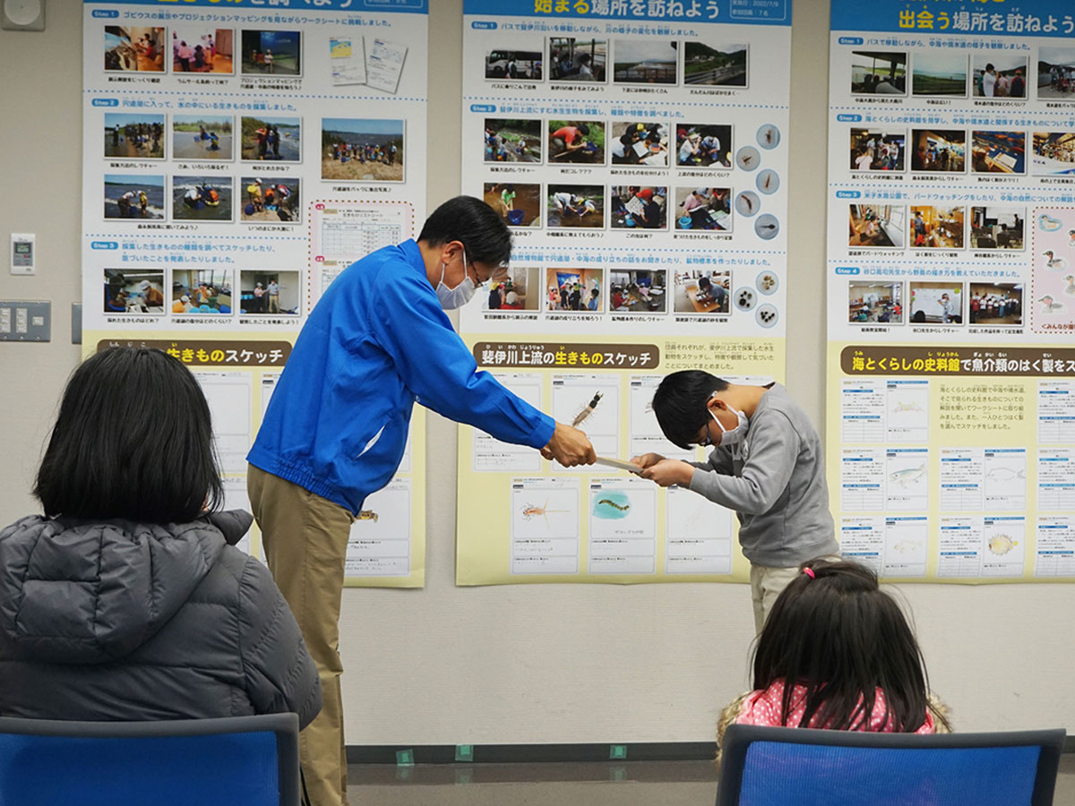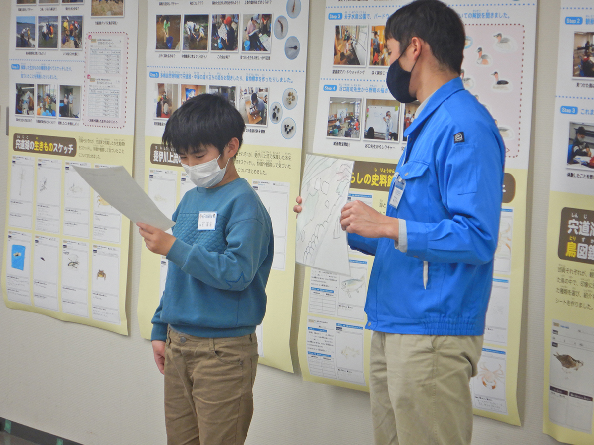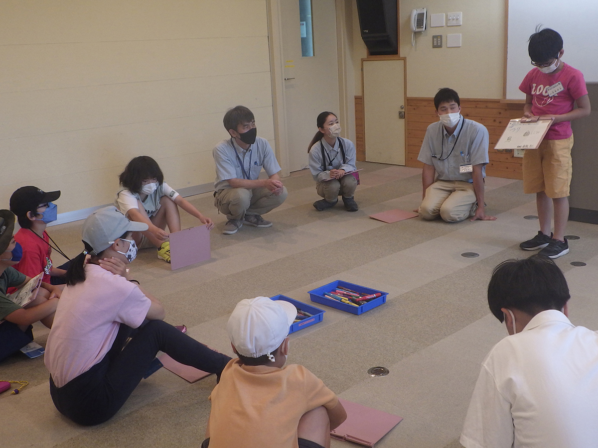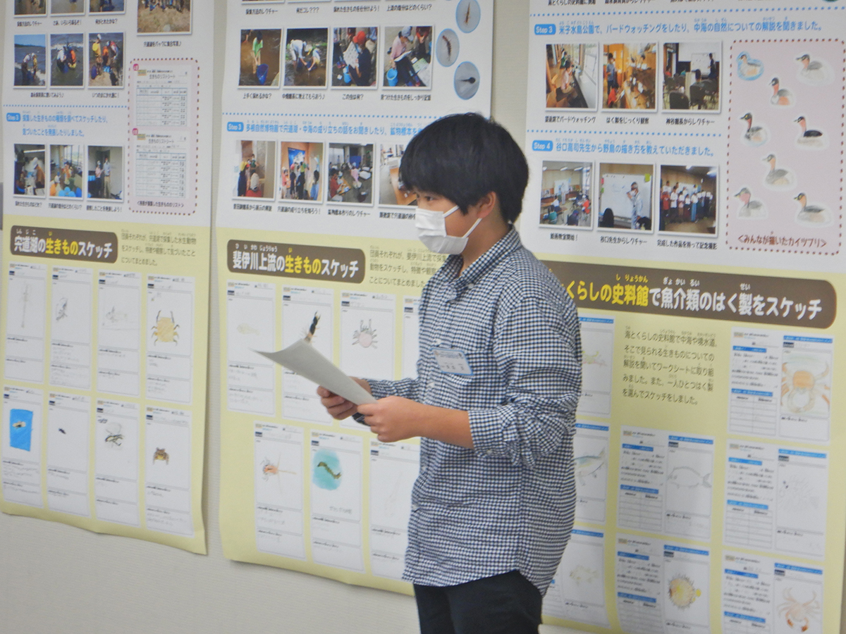 今年度の探偵団の締めくくりとして活動報告会を行いました。午前中は、これまでの活動を振り返ったり、ラムサール条約について学んだことをおさらいしたりした上で、発表のための準備や練習をしました。午後の活動報告会では、団員一人ひとりに活動を通して楽しかったことや印象に残ったこと、発見したことなどを説明してもらったほか、今年度のお題「宍道湖・斐伊川・中海が私たちにもたらしてくれる自然のめぐみを見つけて教えてください」に対する答えを発表してもらいました。どの団員も堂々と発表し、保護者のみなさんから出た質問にもしっかりと受け答えることができていました。また、斐伊川水系がもたらしてくれるさまざまなめぐみを見つけただけでなく、それらを自分たちが守っていきたいという強い思いを感じることもできました。